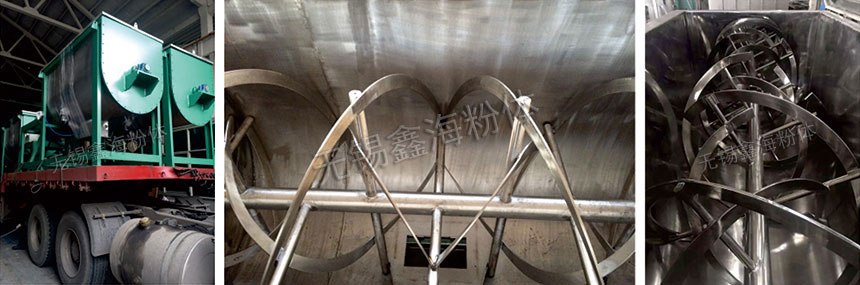 臥式螺帶混合機(jī)由安裝與攪拌軸上的內(nèi)外徑螺條帶動桶體內(nèi)物料,使攪拌器在桶體內(nèi)大范圍翻動物料。攪拌器結(jié)構(gòu)上,螺條設(shè)計成內(nèi)外、左右互為反螺條,攪拌器工作時內(nèi)螺條帶動靠近軸心處物料做軸心旋轉(zhuǎn),軸向由內(nèi)至兩側(cè)推動,外螺條帶動靠近桶壁物料做軸心旋轉(zhuǎn),軸向由兩側(cè)至內(nèi)推動,于是造成物料在桶體內(nèi)對流循環(huán)、剪切摻混,完成物料在較短時間內(nèi)快速均勻混合。